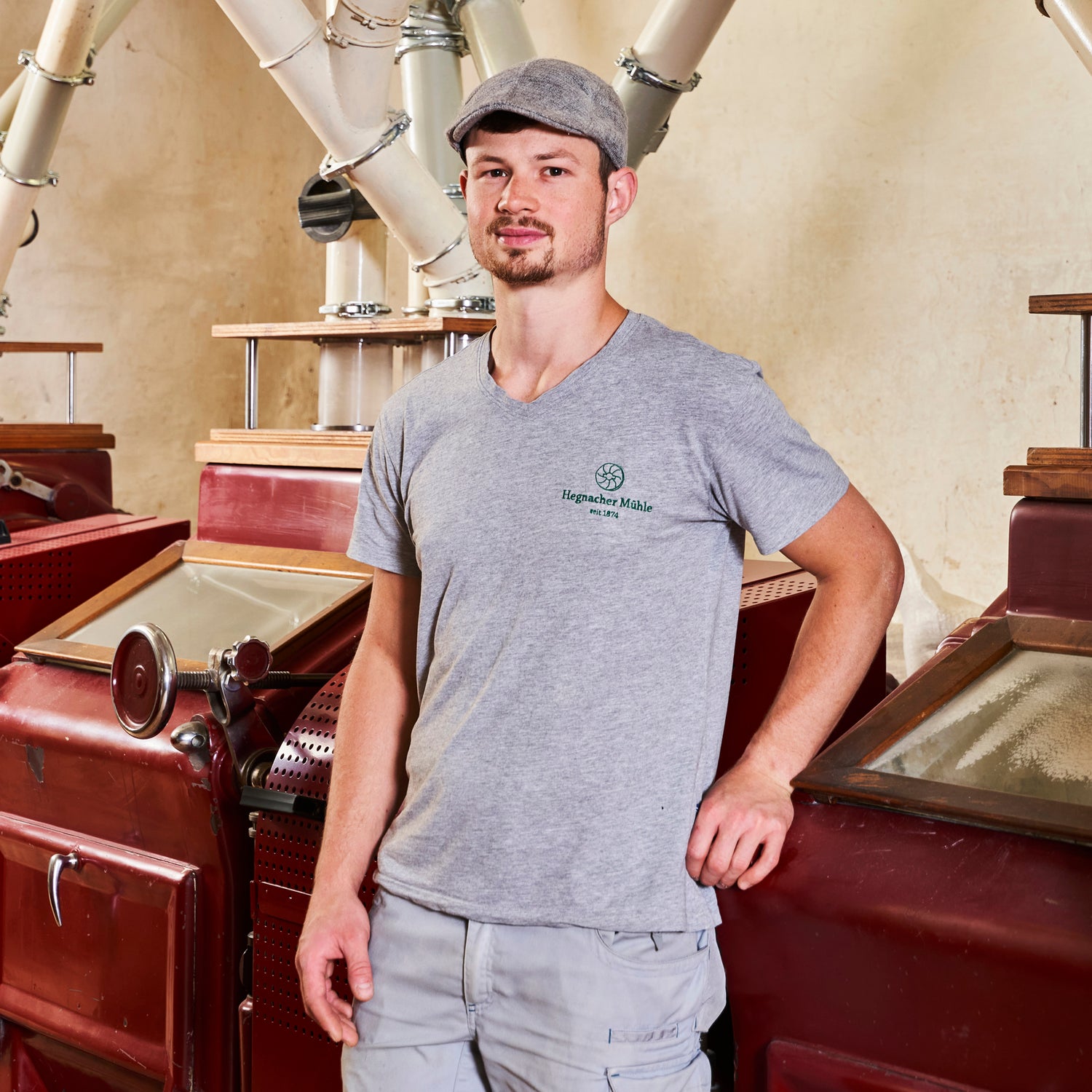 Janek Scholz, Müllermeister seit 2016, hat sich eine der zahlenmäßig eher weniger vertretenen Müllerinnen geangelt und 2018 in den Familienbetrieb eingeheiratet. Seit 2019 leitet er nun die Produktion der Hegnacher Mühle, von der Getreideannahme bis hin zur Verpackung. In den wenigen Verschnaufpausen, die ihm zwischen Mühle, Frau und Kindern vergönnt sind, bleibt er seinem Heimatverein, dem 1.FC Nürnberg treu ergeben.